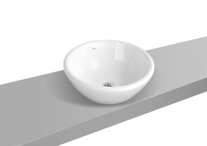 Bacha sobre encimera para lavatorio de porcelana sanitaria color blanco, 40.5 Cm de diámetro y 16.5 Cm de altura, marca Roca de la colección Zen.